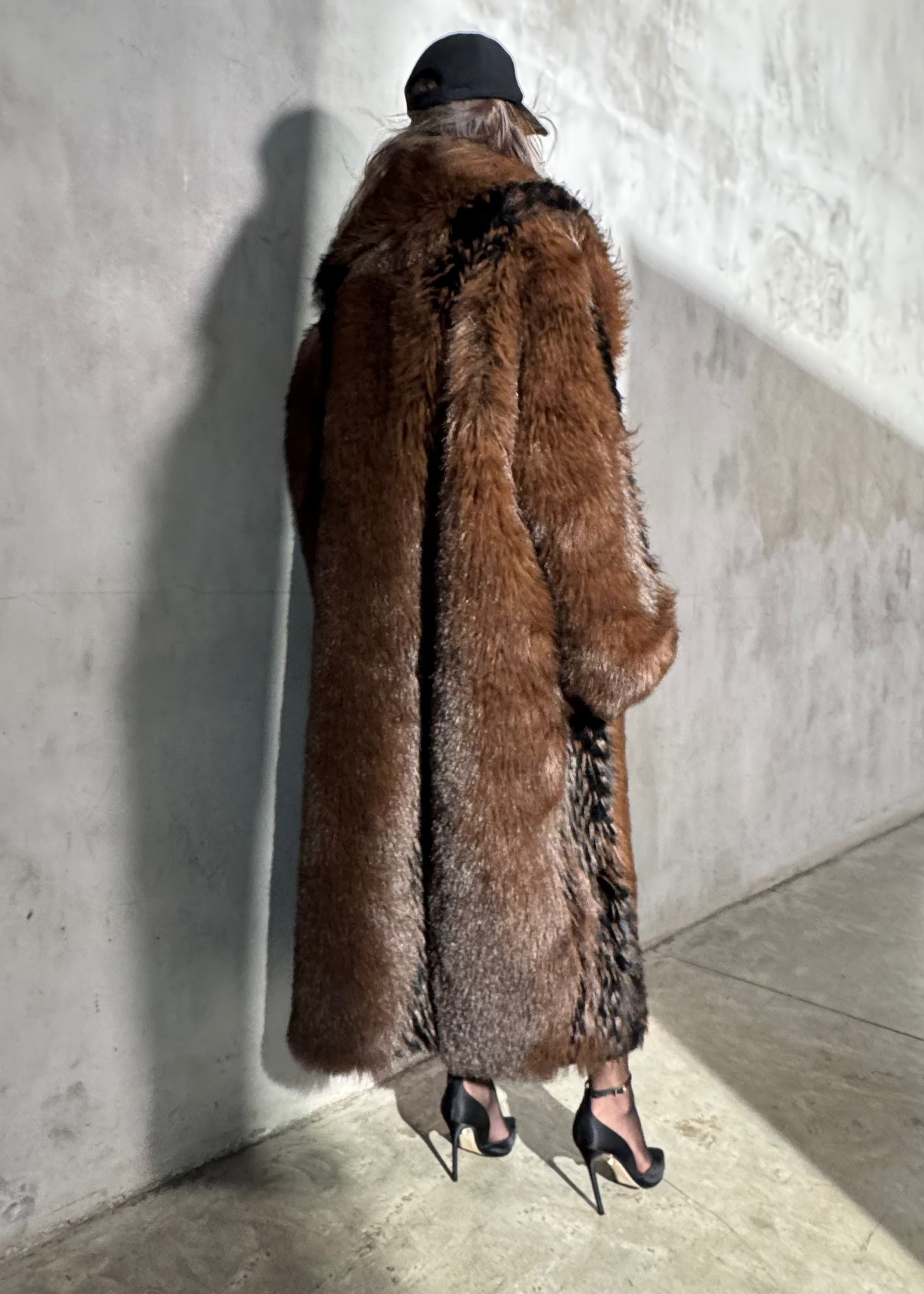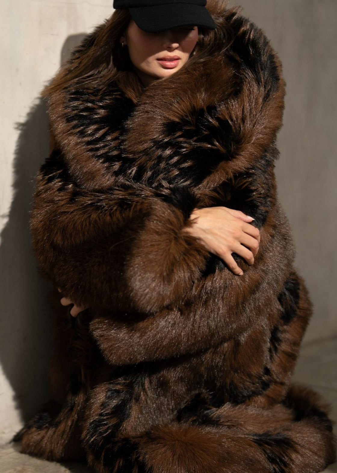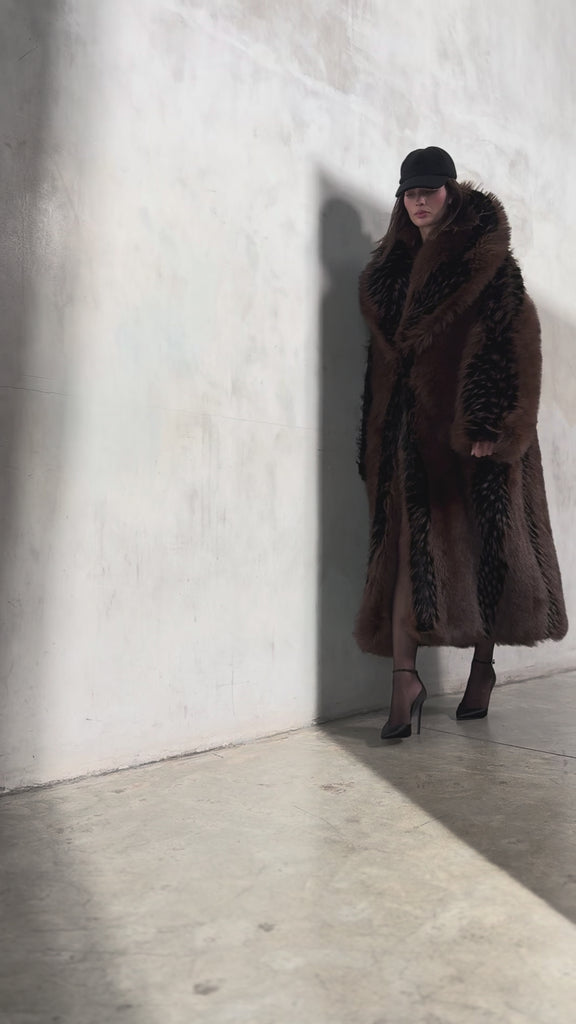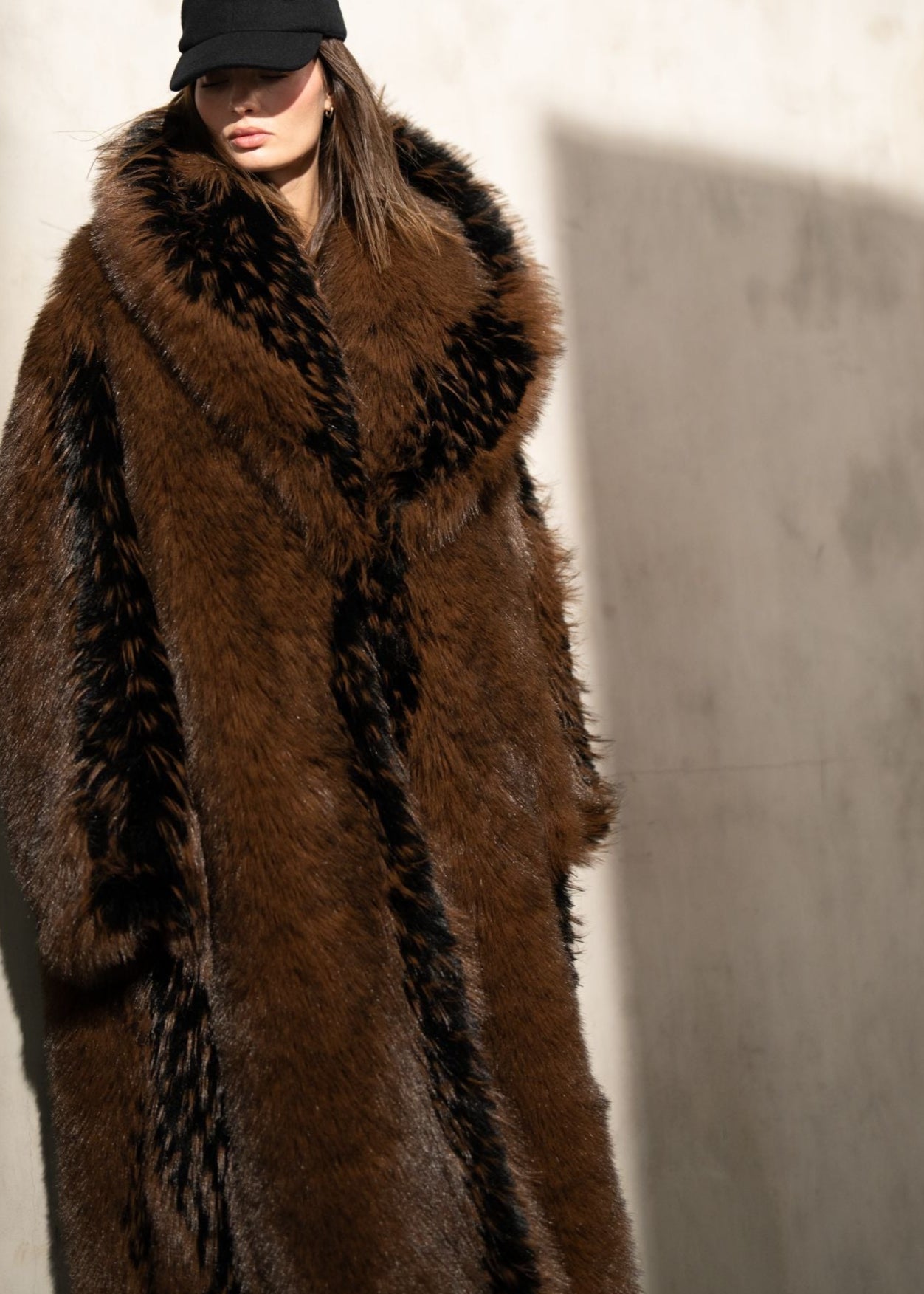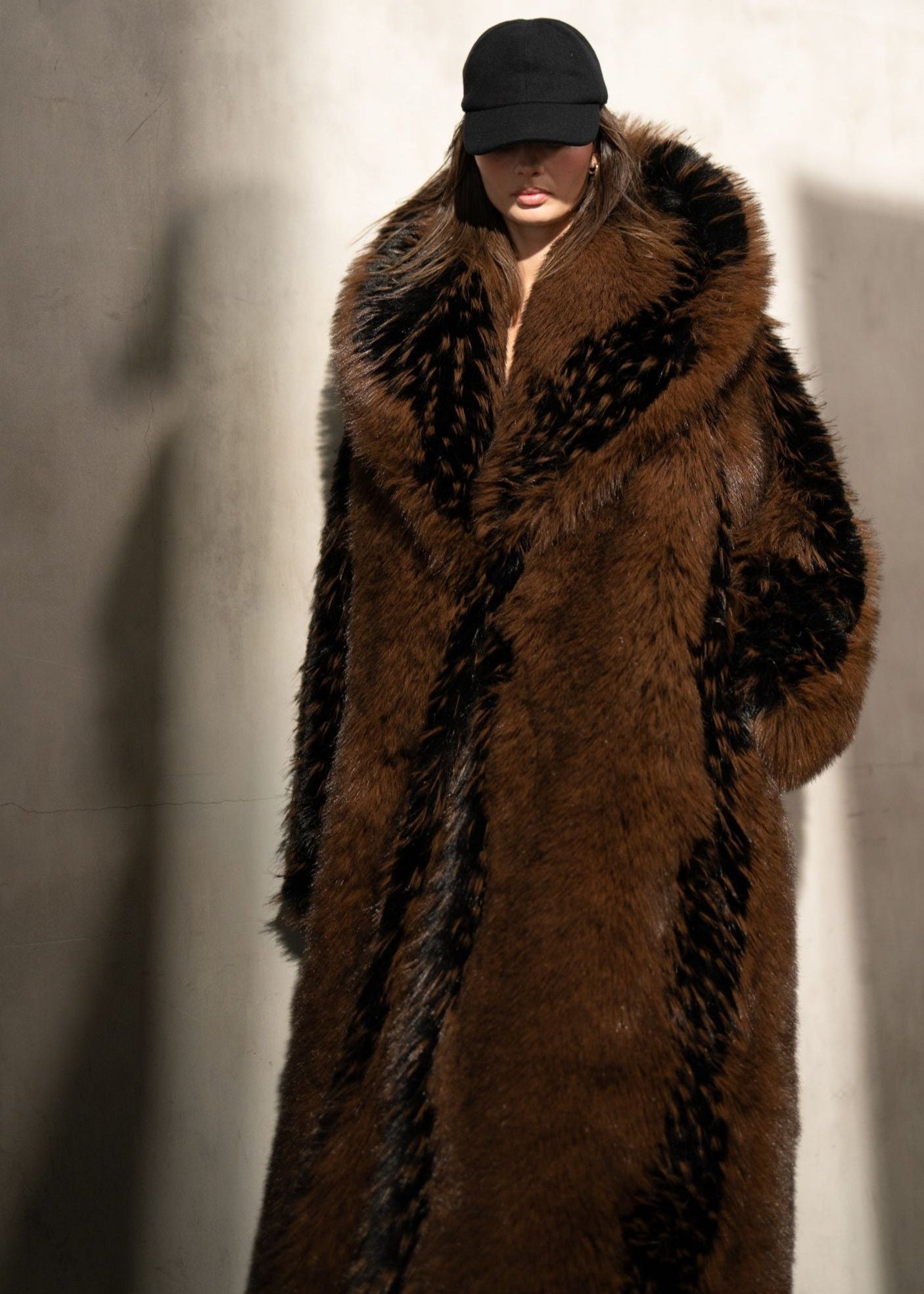 A full-length coat in brown and black faux fur. Designed with an exaggerated shawl collar and sculptural volume for a look that’s bold, tactile, and unmistakably refined.