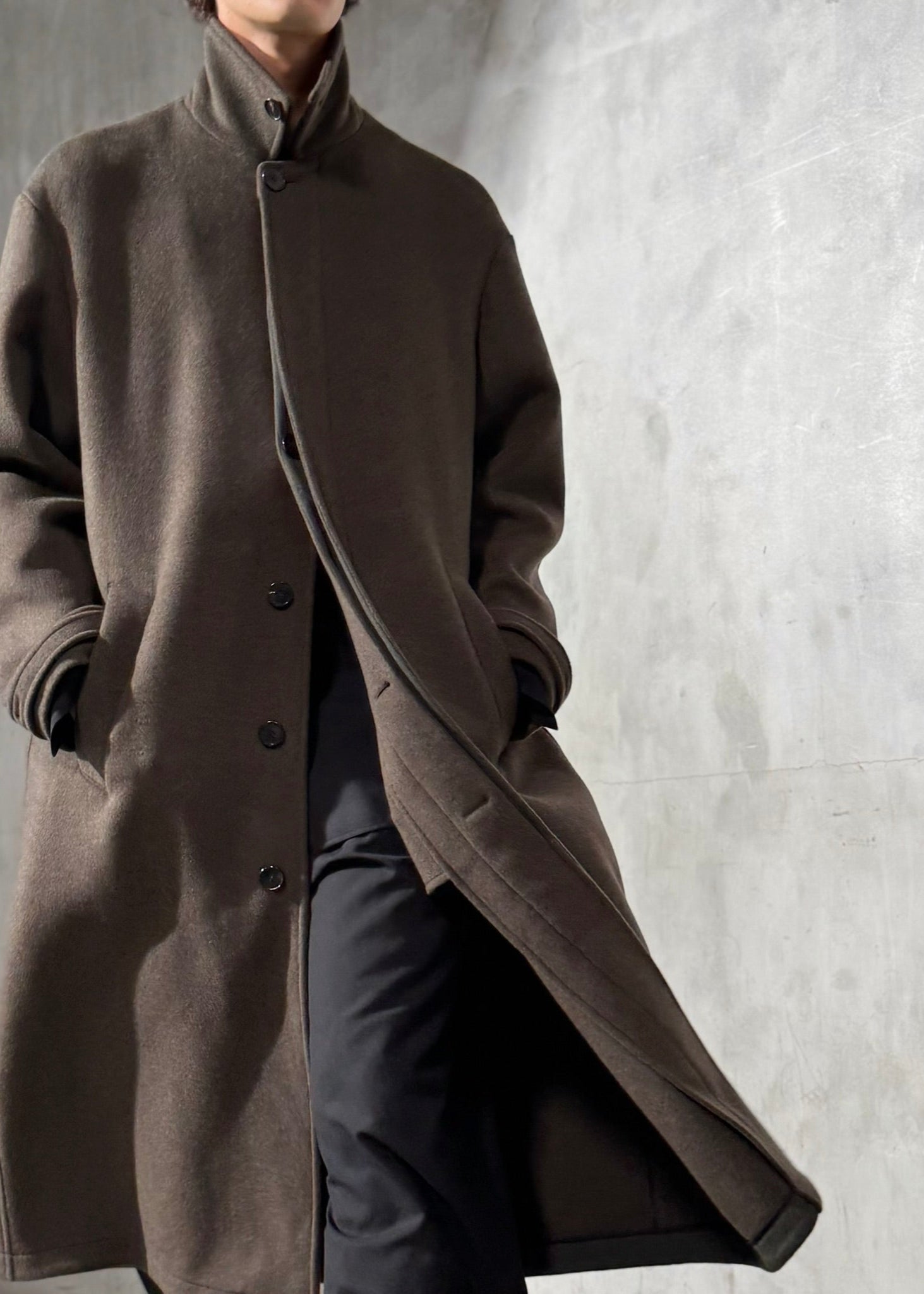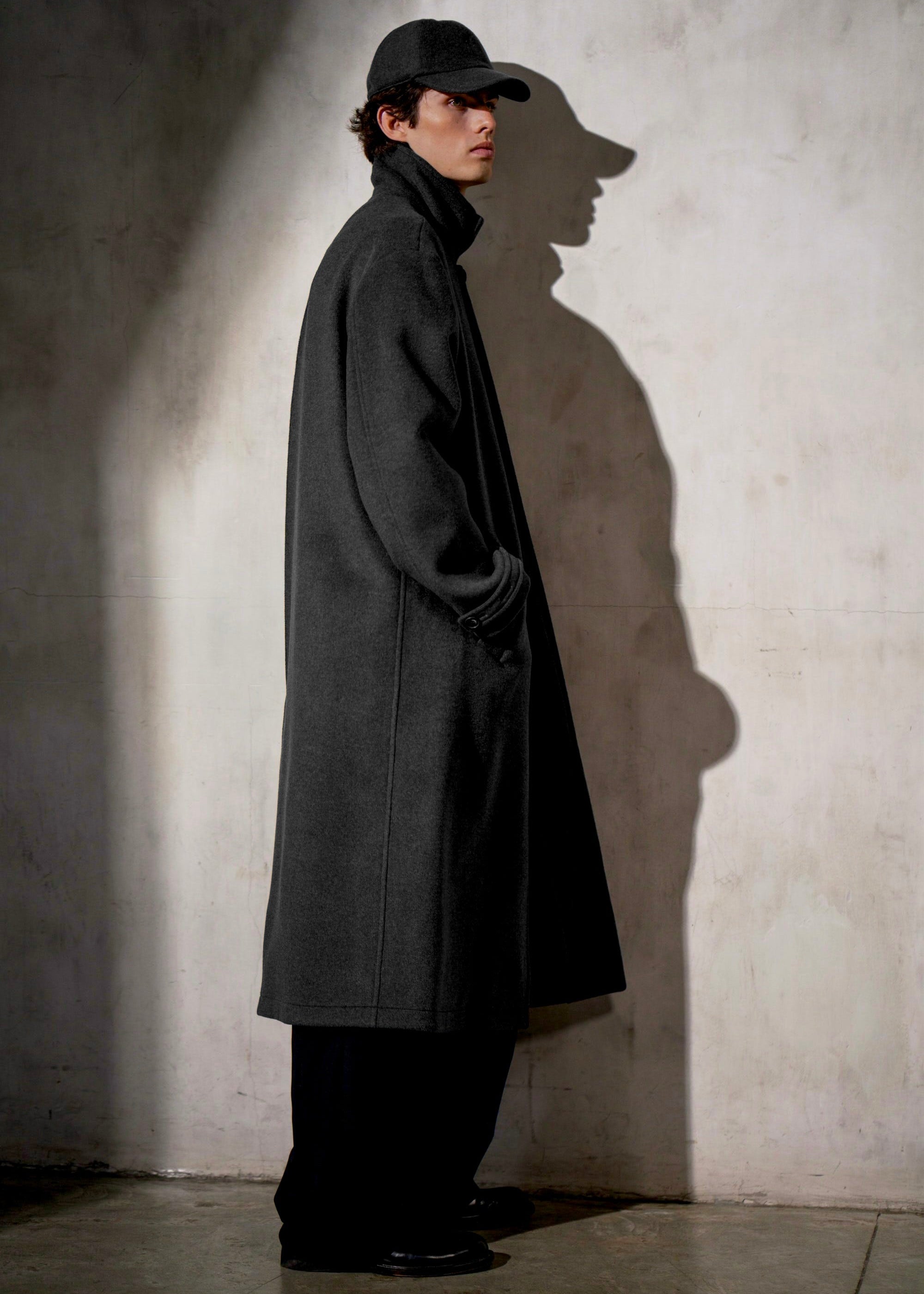 A modern mac coat in luxurious Italian wool, defined by a knife back pleat