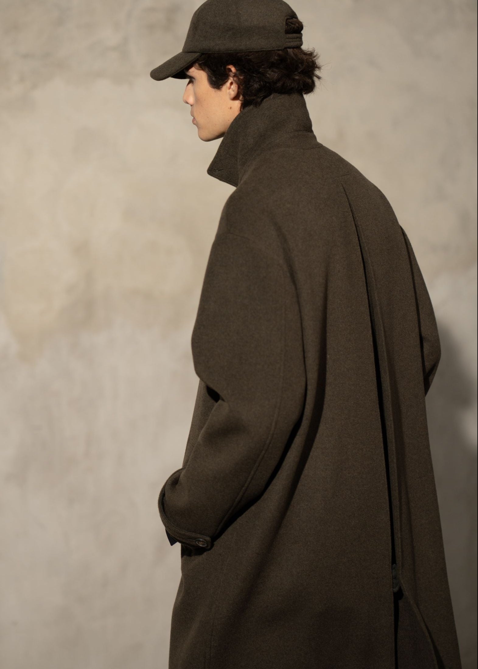 A modern mac coat in luxurious Italian wool, defined by a back knife pleat.