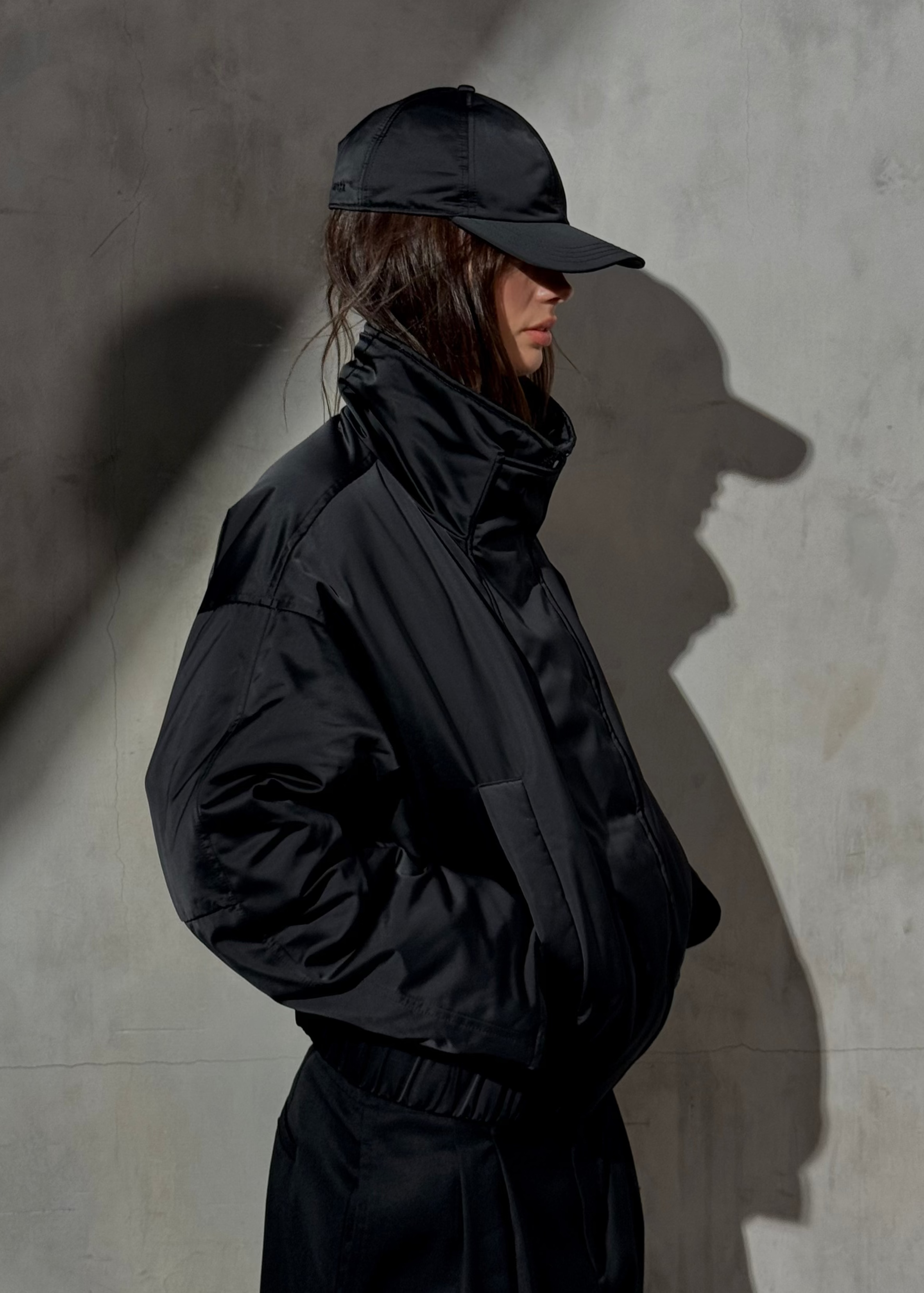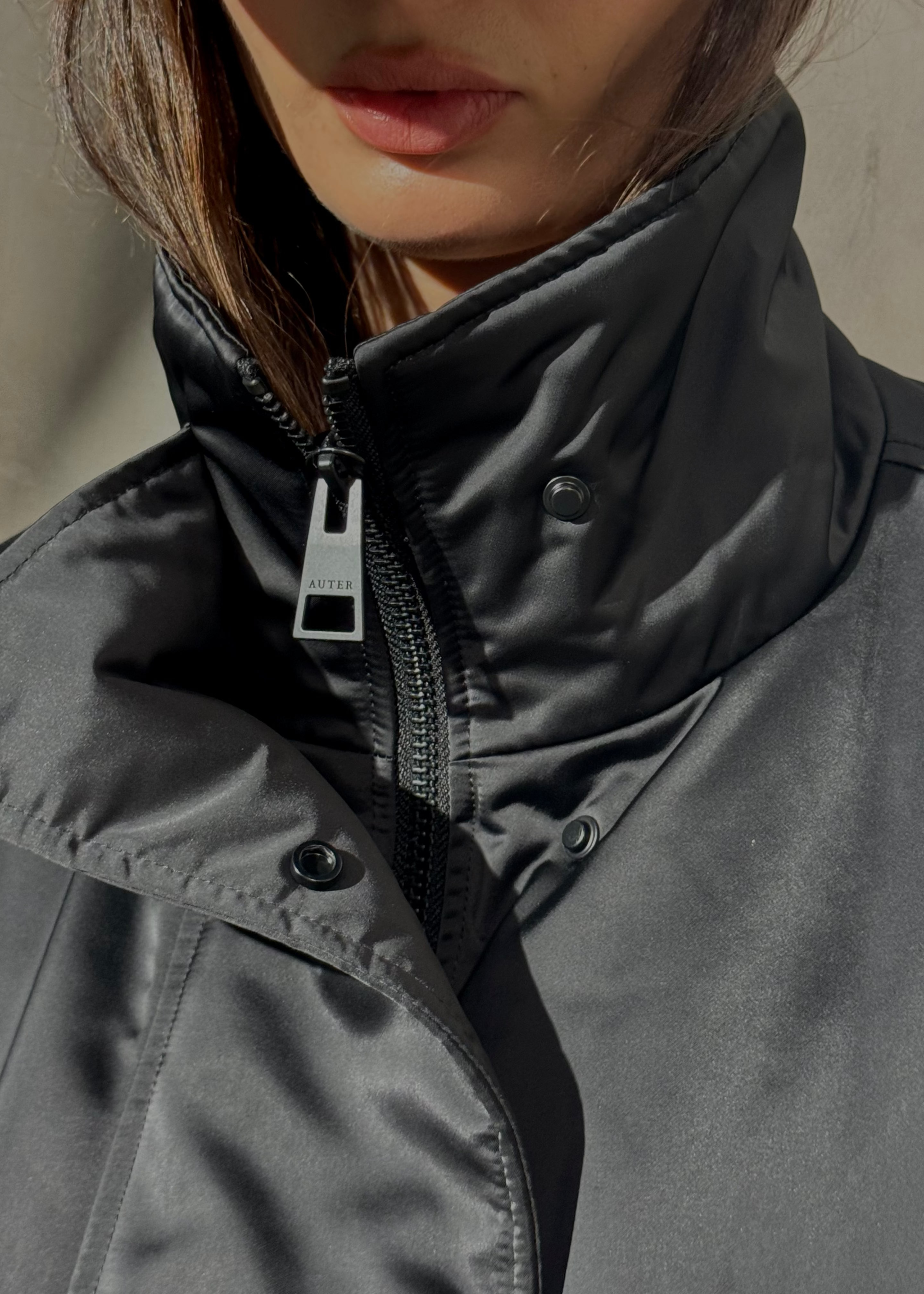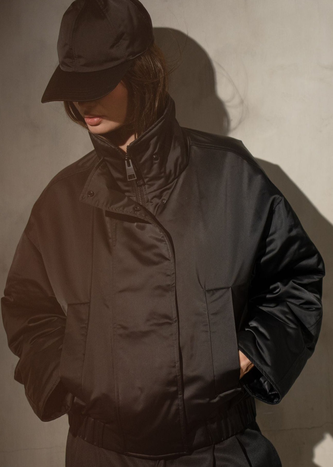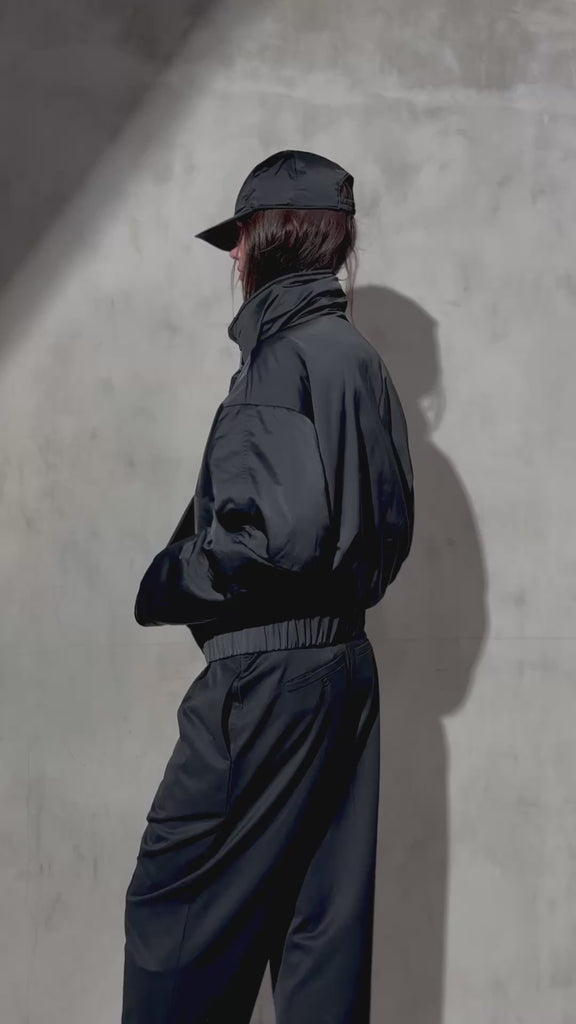 Modern and sculptural, this cropped down bomber is crafted from water and wind resistant matte sateen with a soft sheen. Designed with voluminous sleeves, a wide collar, and modern style.