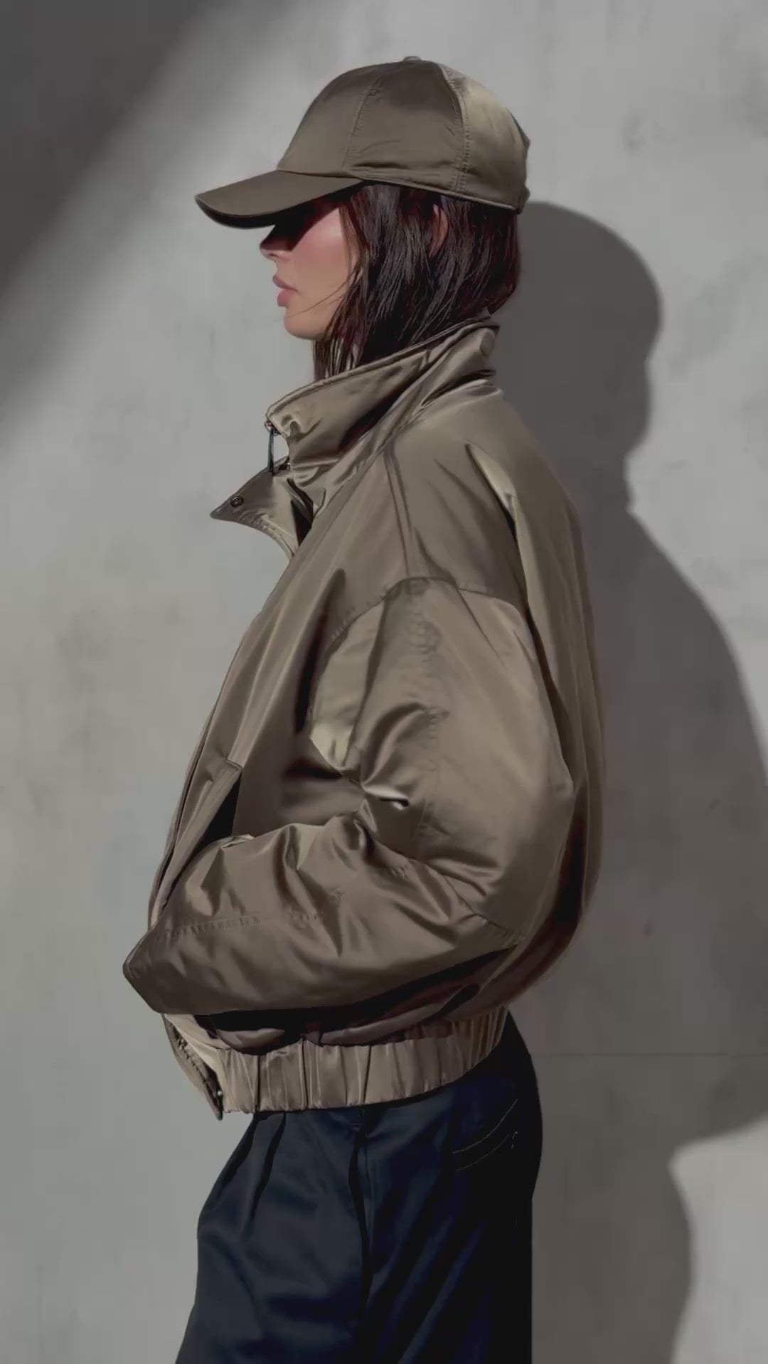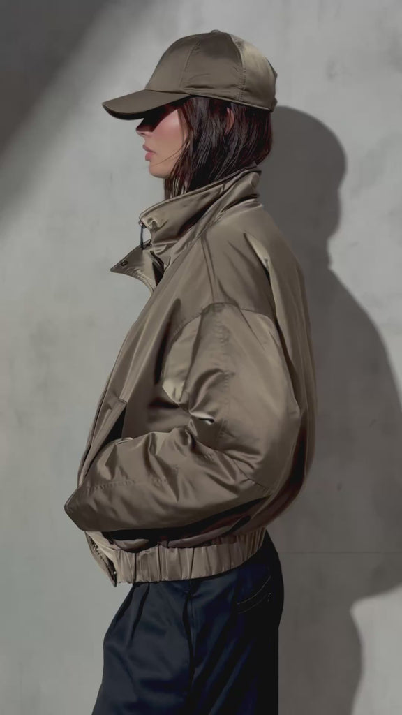 Modern and sculptural, this cropped down bomber is crafted from water and wind resistant matte sateen with a soft sheen. Designed with voluminous sleeves, a wide collar, and modern style.