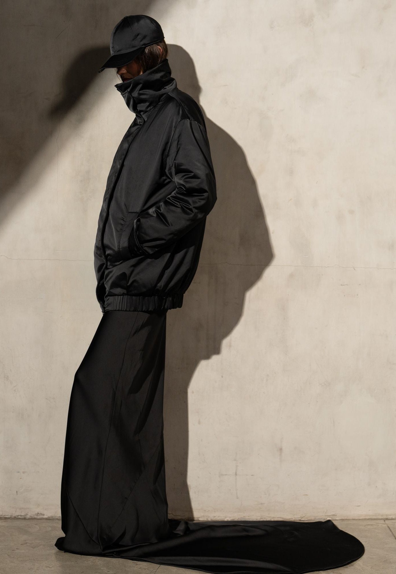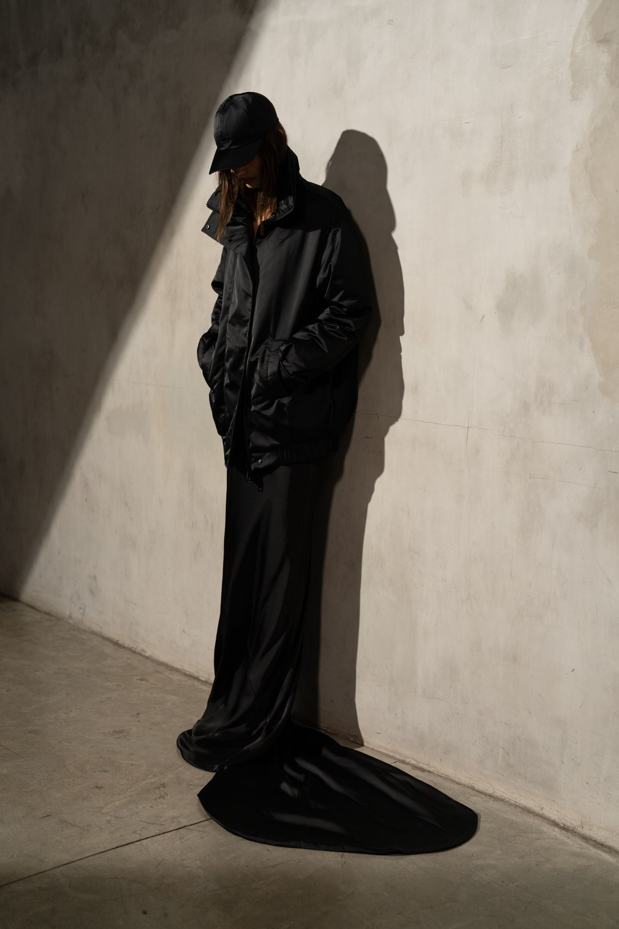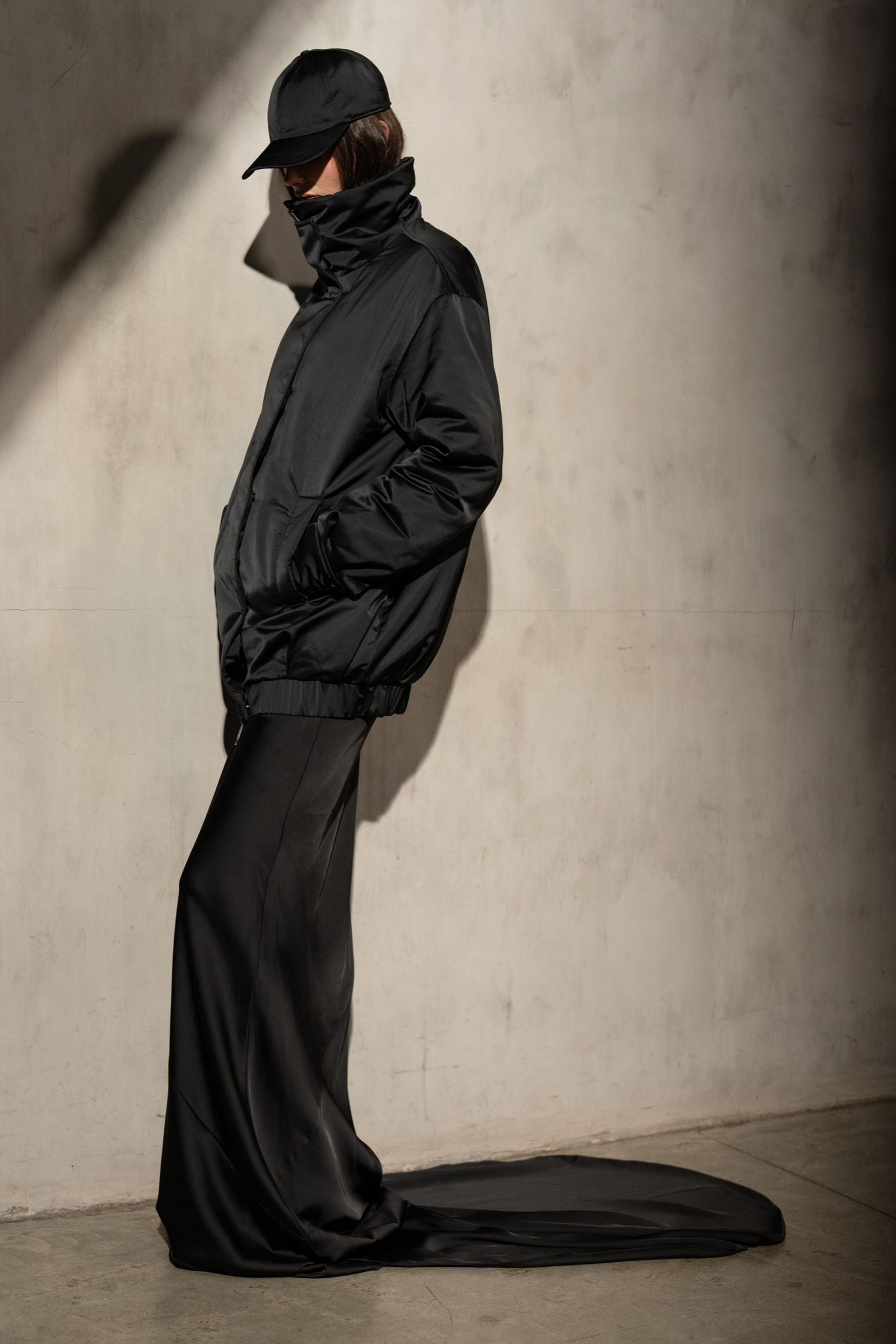 A sleek mid-length bomber crafted from a matte sateen water and wind resistant shell with a subtle sheen. Down-filled for lightweight warmth, it balances utility and refinement with a sculptural everyday silhouette.