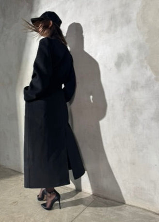 Long, clean silhouette with dropped shoulders and a sharp notch collar