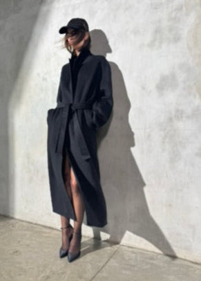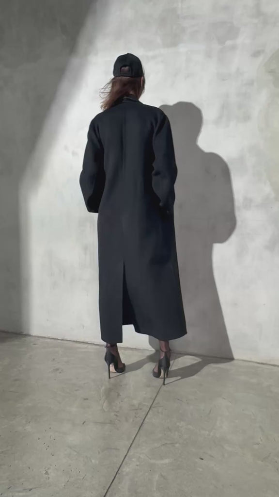 An unlined topcoat in double-faced cashmere wool—fluid, elongated, and deliberately understated.