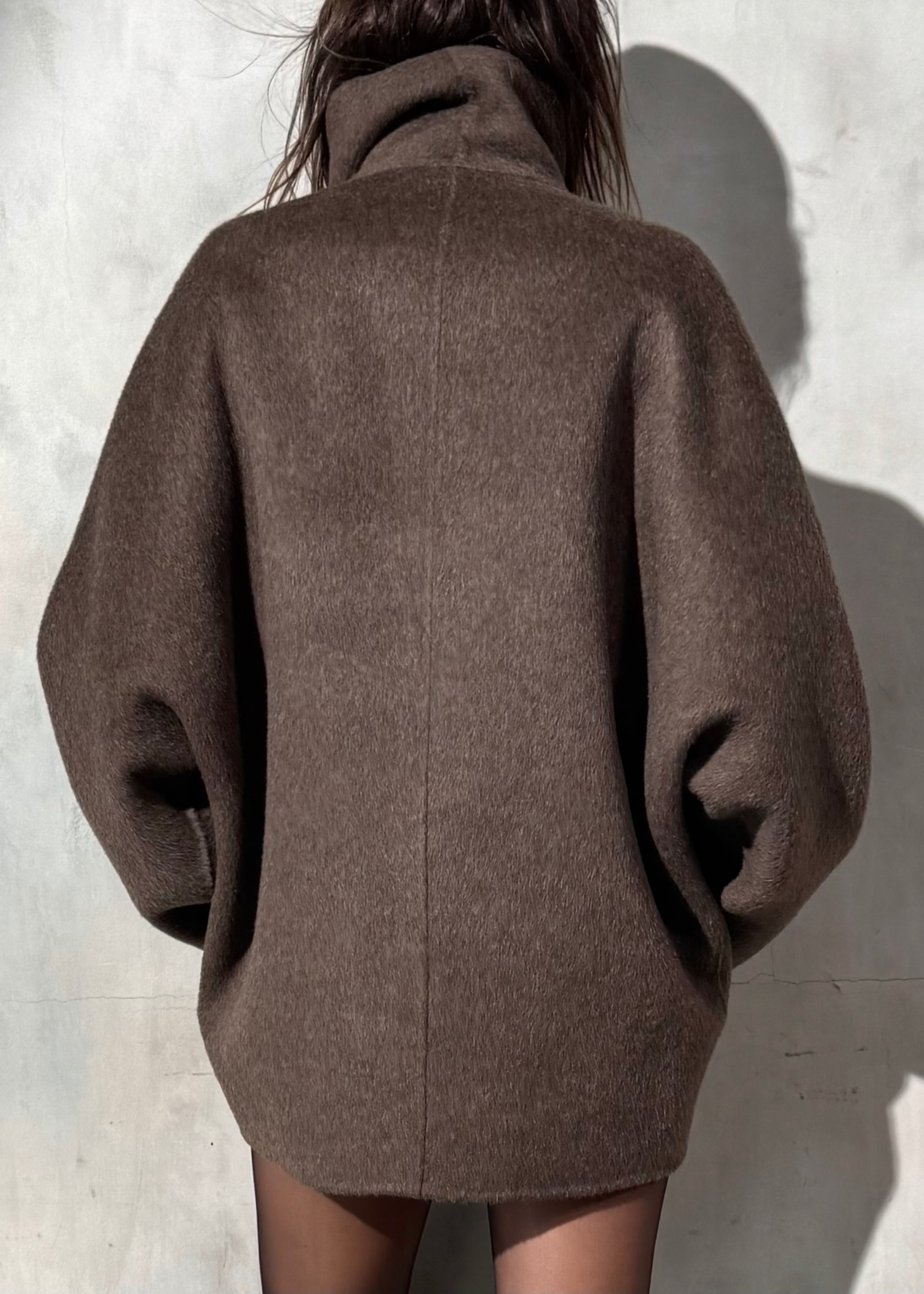 An unlined wrap coat in a double-faced mohair wool blend. Sculptural yet fluid, it features dolman sleeves, a generous shawl collar, and an oversized silhouette that drapes with quiet precision.