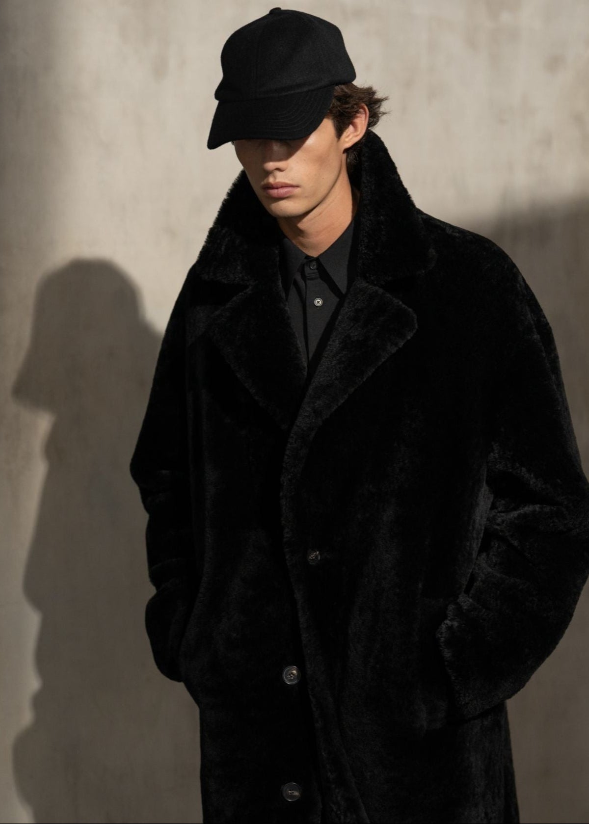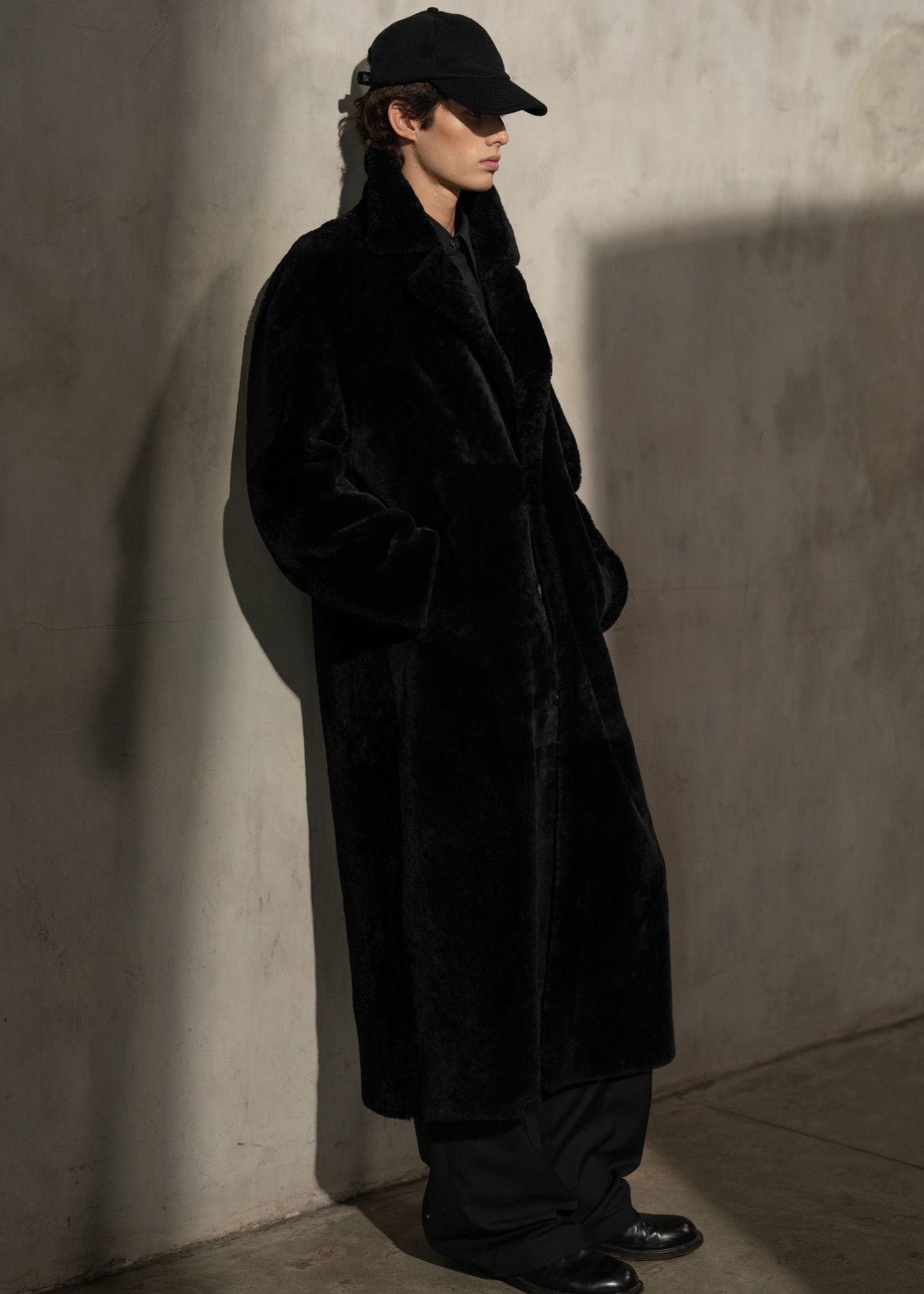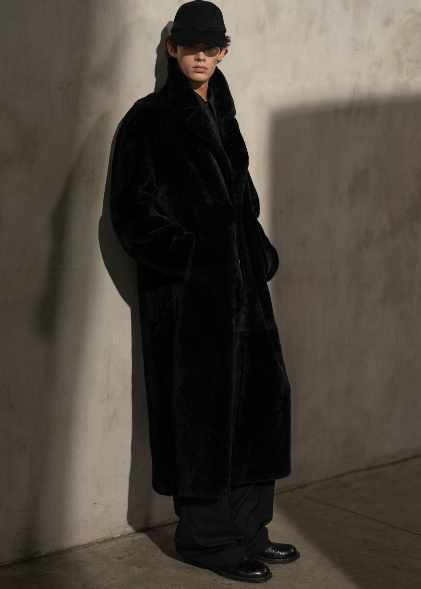 A long topcoat in rich, high-pile shearling. Designed with a sculpted collar and extended silhouette that redefines winter structure with warmth and presence.