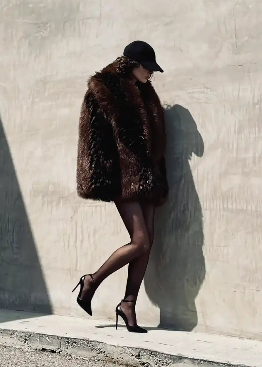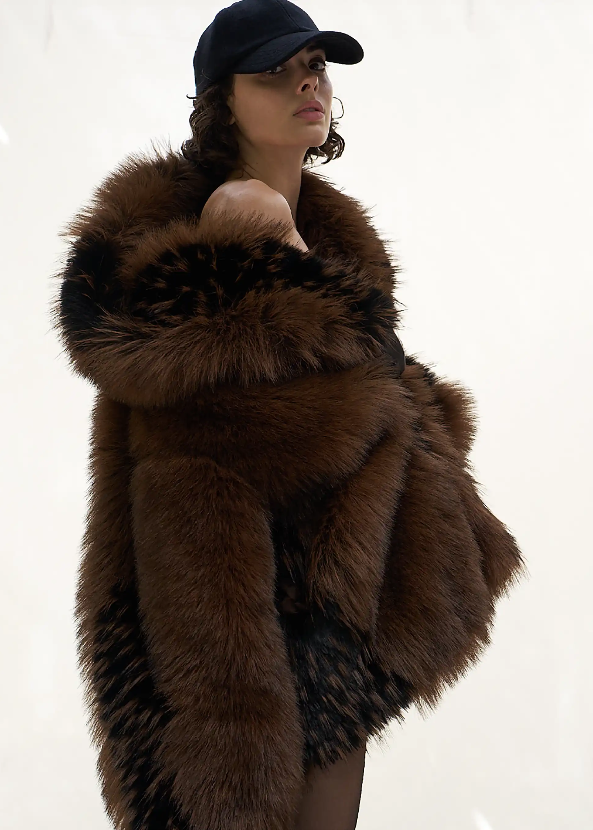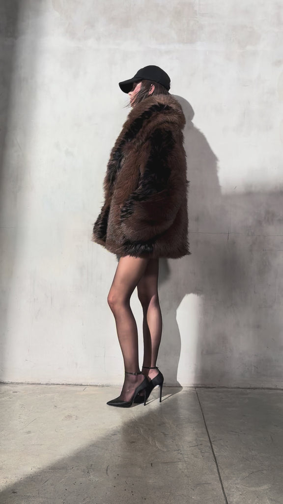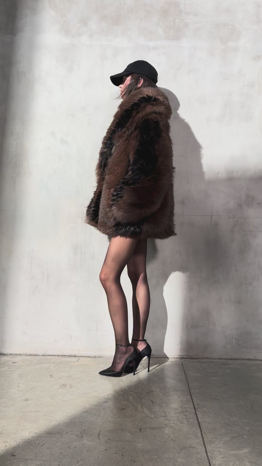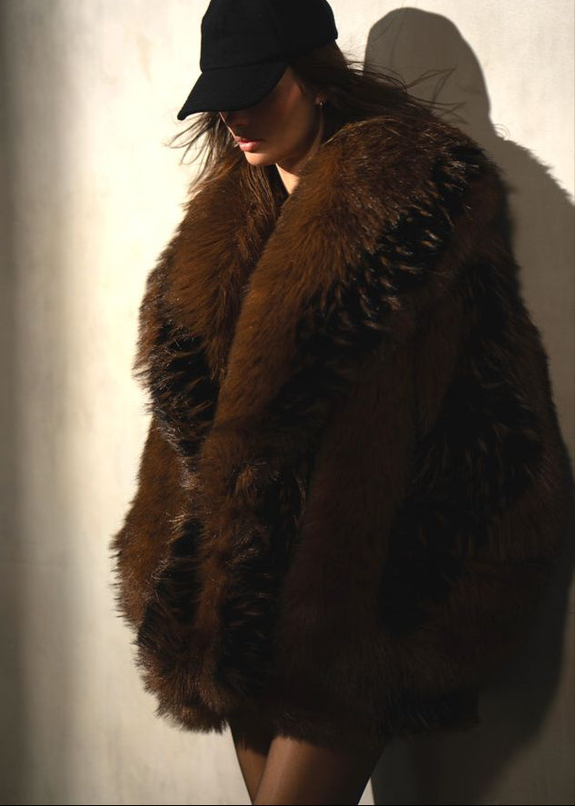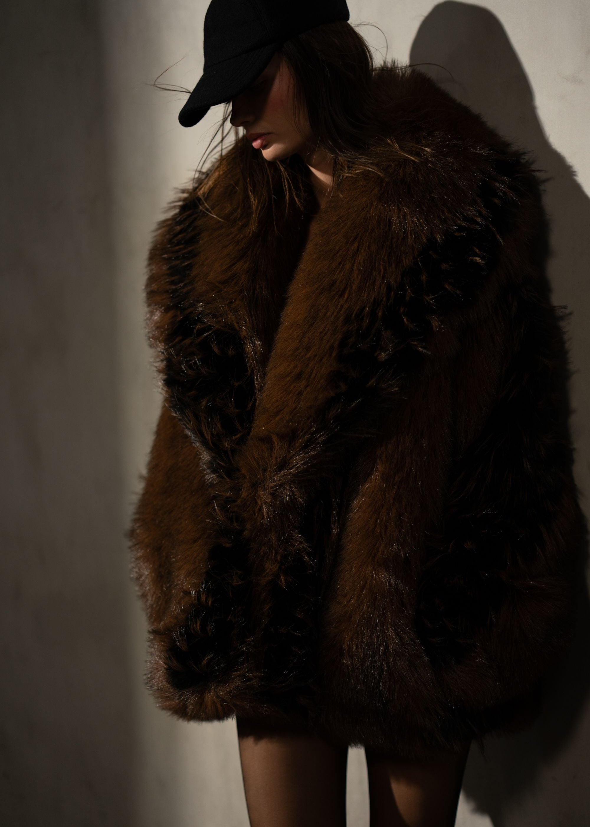 A mid-length coat in brown and black faux fur. Defined by an exaggerated shawl collar and sculptural volume that blends modern luxury with ease.